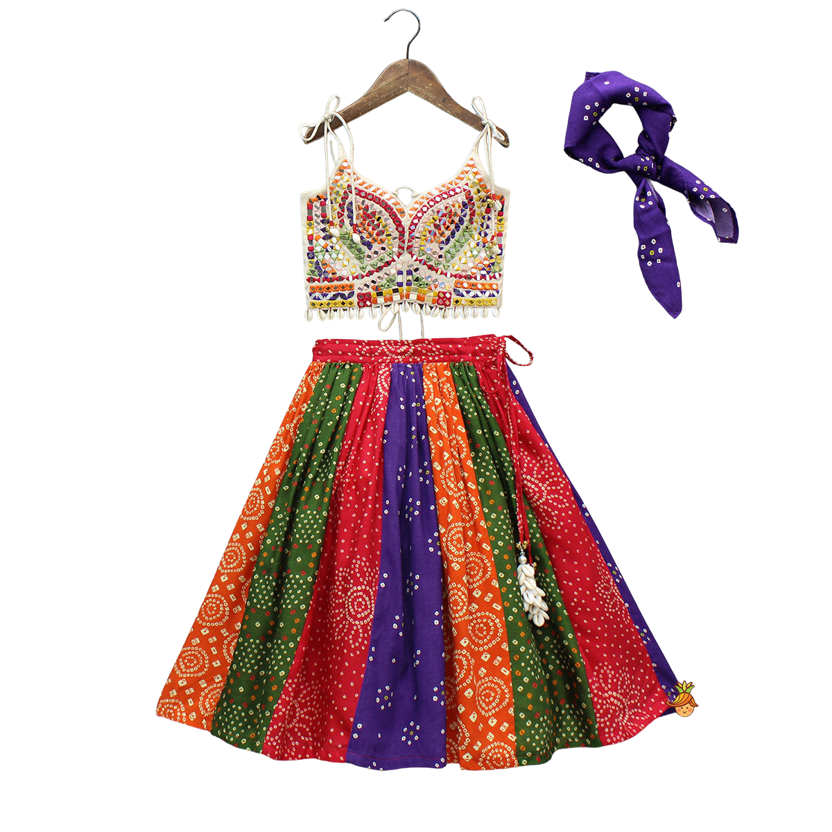 Navratri Special – Mirror-Embroidered Tie-Up Top with Multicolour Bandhani Lehenga & Matching Bandana